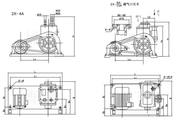 (4)2X型旋片式真空泵型號表示方法:如2X-4,2代表雙級泵,X代表旋片式真空泵,一橫線后面的數(shù)字4代表每秒鐘的抽速。