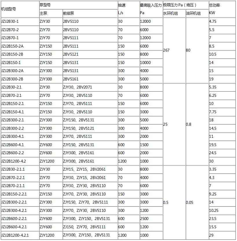 5、根據(jù)實際工況條件選用合適的機組配置。例如:JZJ2B300-4.1機組及JZJ2B300-2.1機組的最大抽氣速率及極限壓力都是相同的,所不同的是它們的工作范圍及消耗的功率不同,JZJ2B300-4.1機組正常工作范圍為2000Pa~125Pa,而JZJ2B300-2.1機組的正常工作范圍為5000Pa~125Pa,很明顯JZJ2B300-2.1機組的正常工作范圍更寬,但其所消耗的功率也更大。如果能確認(rèn)被抽系統(tǒng)的工作壓力<2000Pa時,應(yīng)優(yōu)先選用JZJ2B300-4.1機組以節(jié)約能源。如果要求機組對系統(tǒng)有較強的預(yù)抽能力且機組需較長時間工作在較高壓力時,則選用具有更大的前級泵的JZJ2B300-2.1機組更為合適。